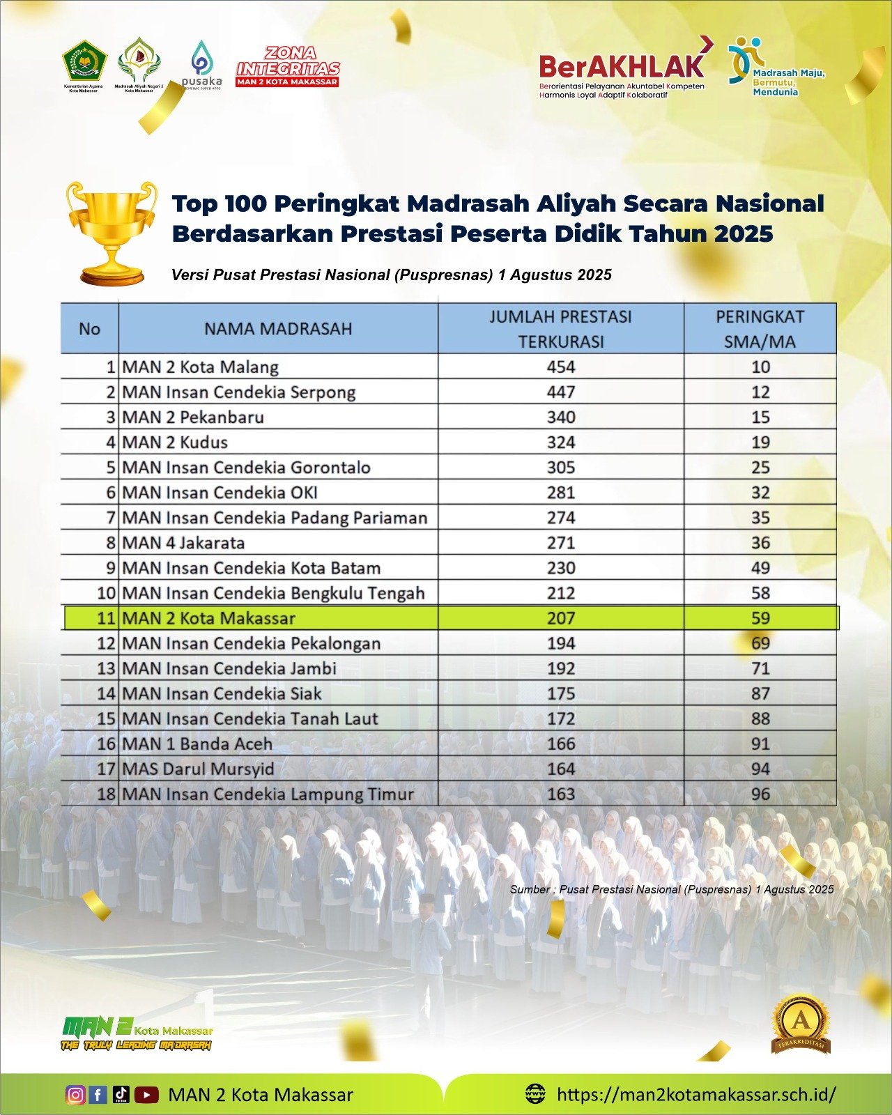 MAN 2 Kota Makassar Masuk Top 100 Nasional SMA/MA Terbaik se-Indonesia 2025 Versi Puspresnas